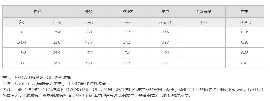 用途:適用于燃料油和石油產品的家用、商用、商業性工業的輸送作業等。Redwing Fuel Oil膠管有2層纖維編織。本品的編織構造,減少了卷翹時扭結合絞繞的發生。平滑的管外層耐拉強度不高。