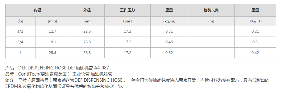 柴油廢氣分解流體(DEF:含32.5%高純度尿素去離子水用來分解氮的液體)是選擇性催化還原系統(tǒng)關(guān)鍵的成分之一,這種系統(tǒng)可以讓柴油車滿足自2010.1.1號生效的嚴厲的排放法規(guī)。DEF是種液體,可以作為一種催化劑加在燃油廢氣中將含有Nox煙霧轉(zhuǎn)化成無害的氮和水蒸氣。DEF加油機管是一種專門為傳輸高純度液態(tài)尿素開發(fā),內(nèi)管材料為專有配方,具有低析出的EPDM和過氧化物硫化從而保證具有析出等級減少污染。柔軟的構(gòu)造可以提供使用和盤卷應(yīng)用。具有導(dǎo)靜電的鋼絲也可提供。
