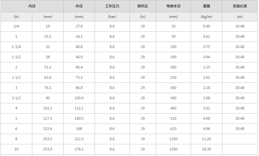 PartI.D.O.D.LengthW.PNo(內徑)(外徑)生產長度工作壓力inchmminchmmMPSIBARMP300-033/164.80.4511.515230020MP300-041/46.40.511315230020MP300-055/167.90.591515230020MP300-063/89.50.671715230020MP300-081/212.70.832115230020MP300-105/815.90.982515230020MP300-123/4191.142915230020MP300-16125.41.4237152300