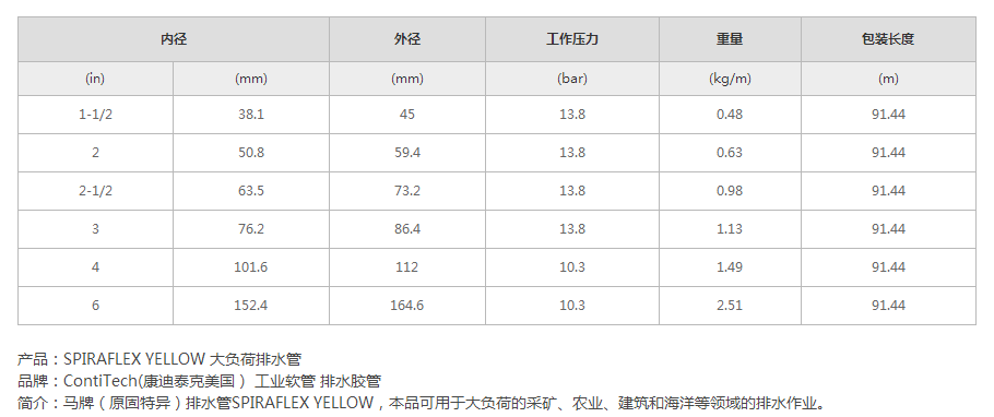 內膠:黑色的特殊耐燃的,以NITRILE(丁腈)為基膠的合成橡膠,具高耐油性(RMA的A等級)。外膠:以乙烯基丁腈為基膠的合成橡膠CHEMIVIC,外管光滑,黑色或紅色,環裹壓印。增強層:多層合成纖維加螺旋鋼絲加強,螺旋鋼絲可接地排靜電。溫度:-35℉~200℉(-37℃~93℃)顏色:黑色紅色內徑外徑工作壓力爆破壓力彎